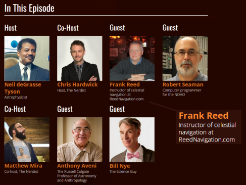 I was recently a guest, aboard as an expert in celestial navigation, on an hour-long episode of StarTalk, a science talk-show hosted by Neil deGrasse Tyson available on various streaming services (look for S4 E10). Dava Sobel, author of "Longitude" also joined us in the studio for one segment. Also available as audio-only (free).